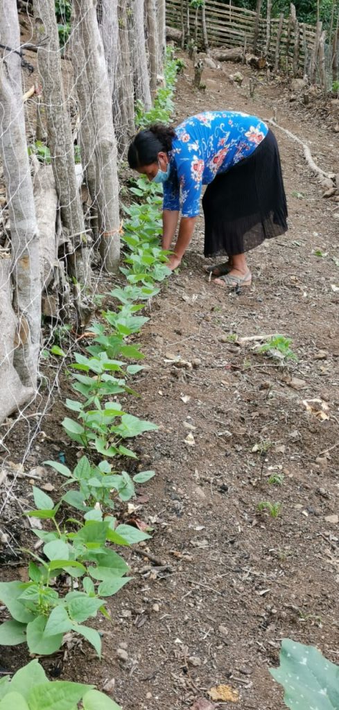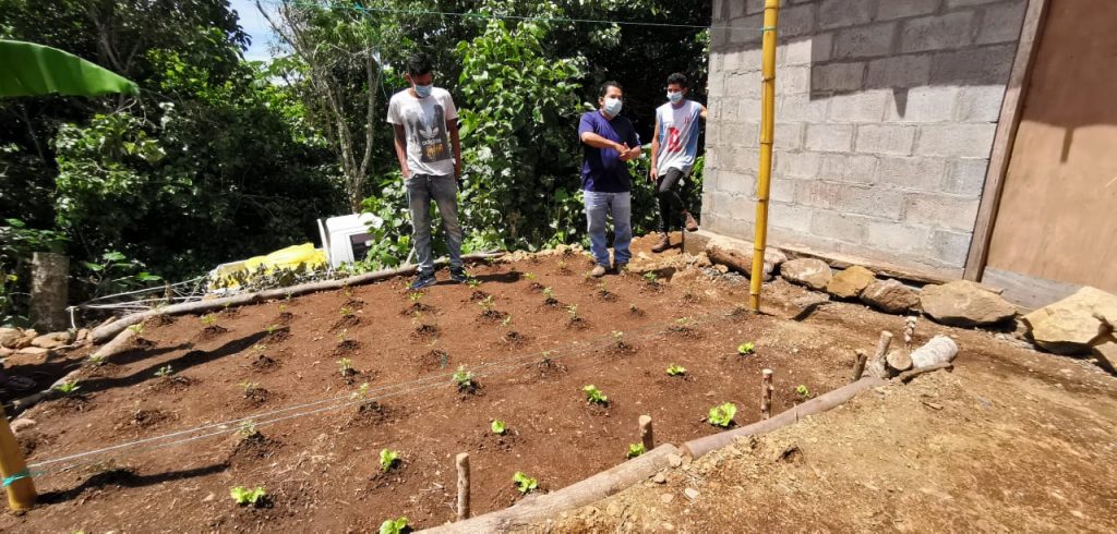 Seguimiento a los huertos caseros y talleres de formación para el fortalecimiento de capacidades de las comunidades, en conocimientos de prácticas agroecológicas desarrollados por REDES. (Moisés Batres, representante de Fundación REDES y Coordinador Nacional del Proyecto, de camisa morada).