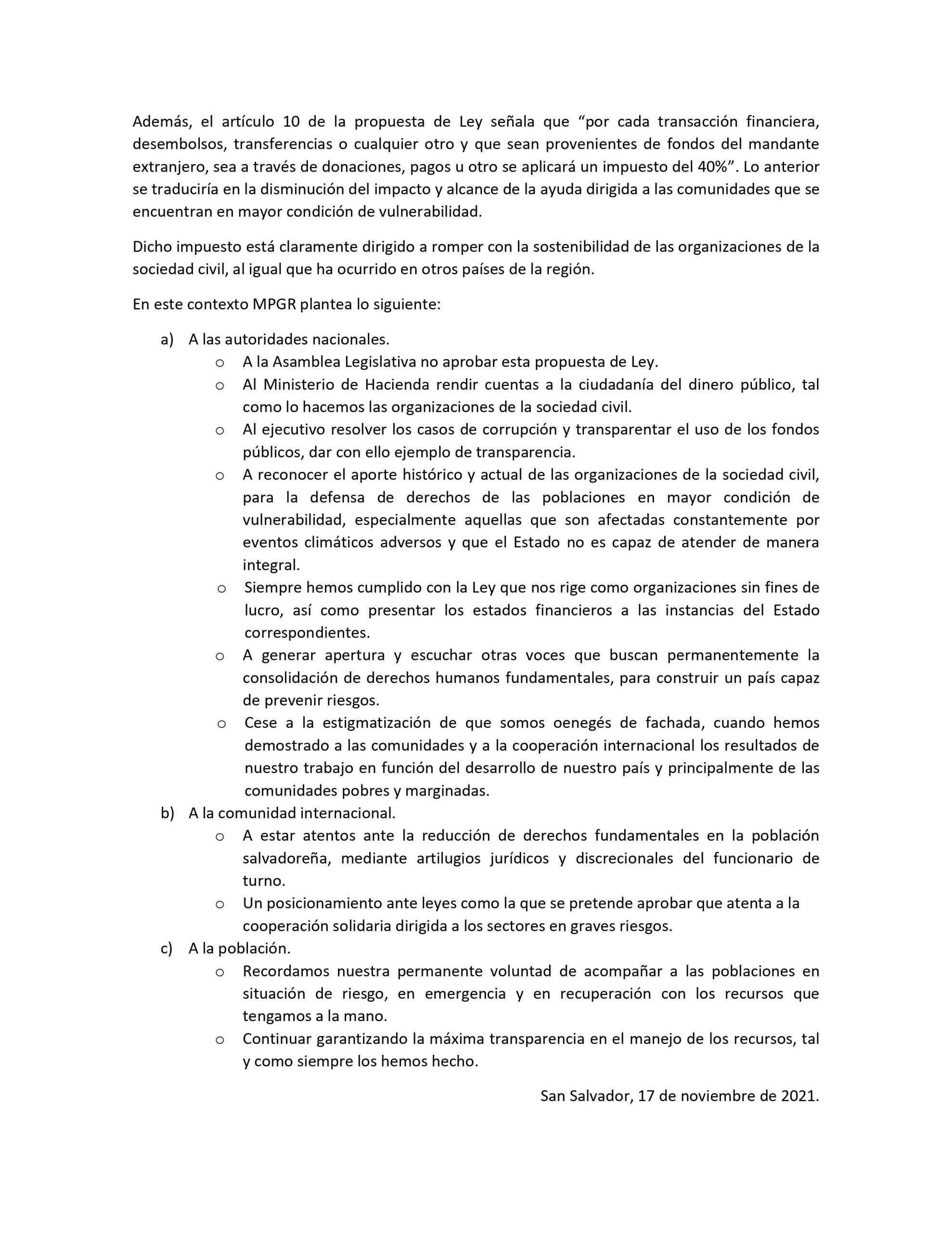 La Mesa Permanente para la Gestión de Riesgos en El Salvador comparte su posicionamiento ante la eventual Ley de Agentes Extranjeros enviada, el pasado martes 9 de noviembre, por el Presidente de la República a la Asamblea Legislativa y que ya cuenta con dictamen favorable de la Comisión de Relaciones Exteriores para votar por su aprobación: