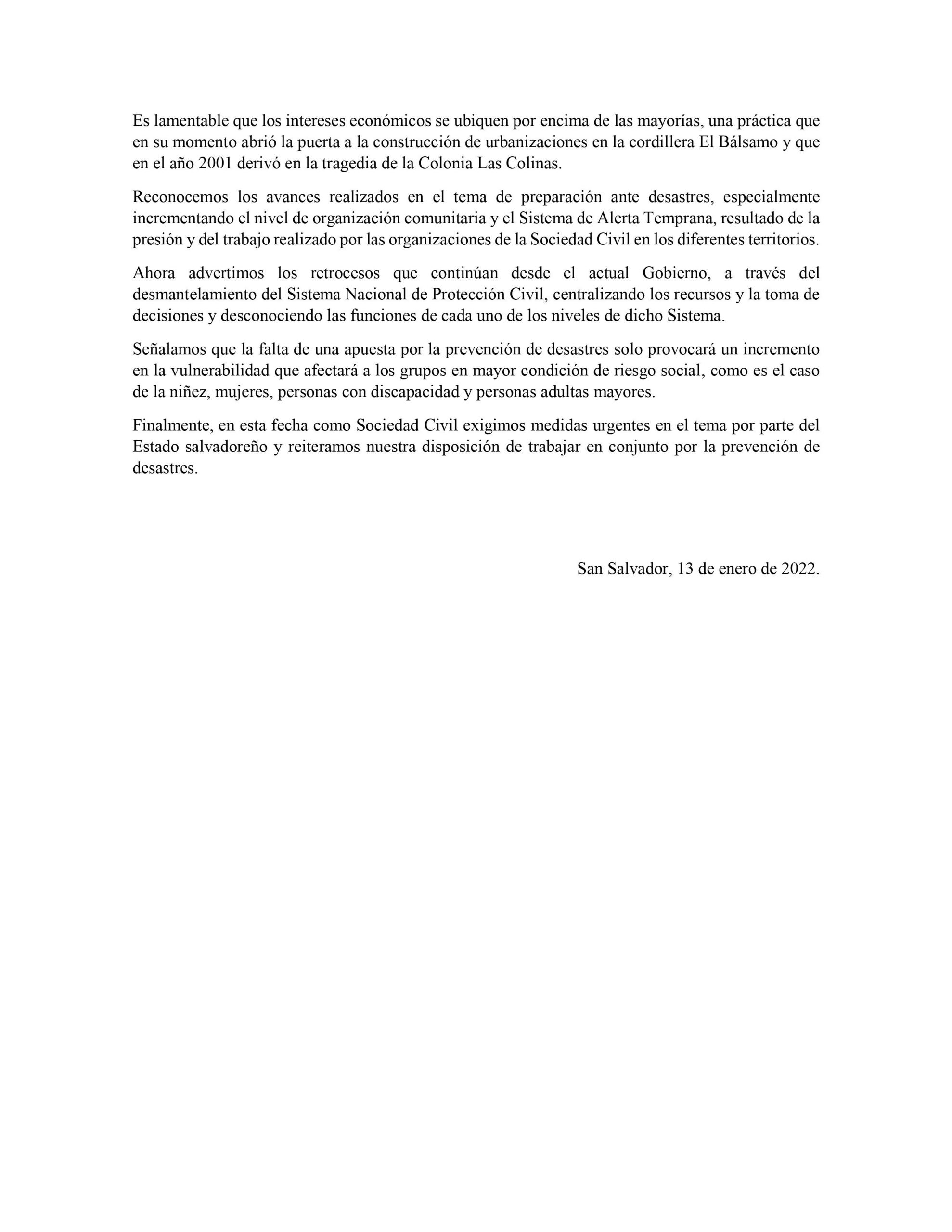En el 21 aniversario del terremoto del 13 de enero del año 2001, como Sociedad Civil nos solidarizamos con las familias que perdieron a seres queridos y exigimos al Estado salvadoreño medidas urgentes enfocadas en la prevención de desastres, además reiteramos nuestra disposición de trabajar en conjunto en el tema. A continuación el posicionamiento completo: