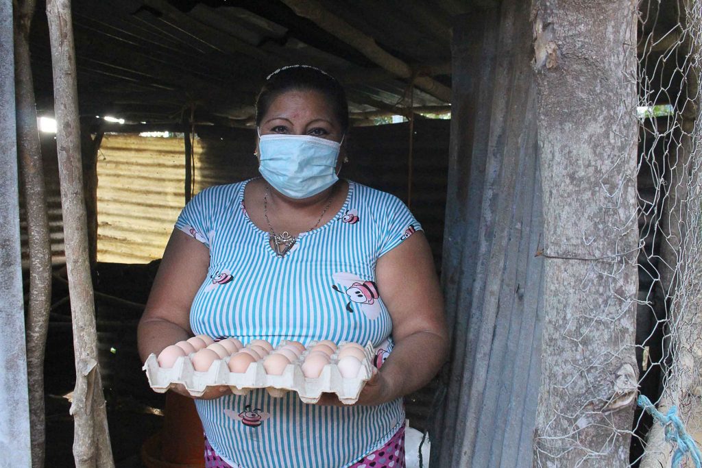 Odilia Campos recoge un cartón de huevos que contribuye a su alimentación y economía familiar.