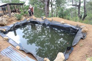 Reservorios de agua con tecnología de geomembrana instalados, por la organización REDES, en el municipio de Alegría, departamento de Usulután, ya se han llenado con las lluvias del pasado invierno, por lo que se espera que esta agua sirva para el riego de las hortalizas en la época de verano. En la foto la beneficiaria, Flor Pérez y su hijo.