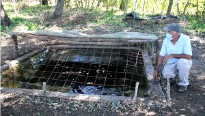 Reservorio con capacidad de 7.5 metros cúbicos, instalado en el municipio de Chinameca, departamento de San Miguel por la organización Oikos Solidaridad. En la foto el beneficiario Miguel Ulloa.