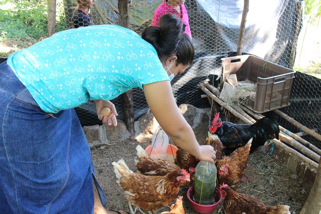 Rosa Salgado, madre soltera, con 3 hijos a su cargo es una de las beneficiarias de la Comunidad Nuevo Amanecer, en el municipio de Intipucá, departamento de La Unión, ella ha recibido gallinas ponedoras e insumos para producir zanahoria, cilantro, tomate y chile, además de árboles frutales.