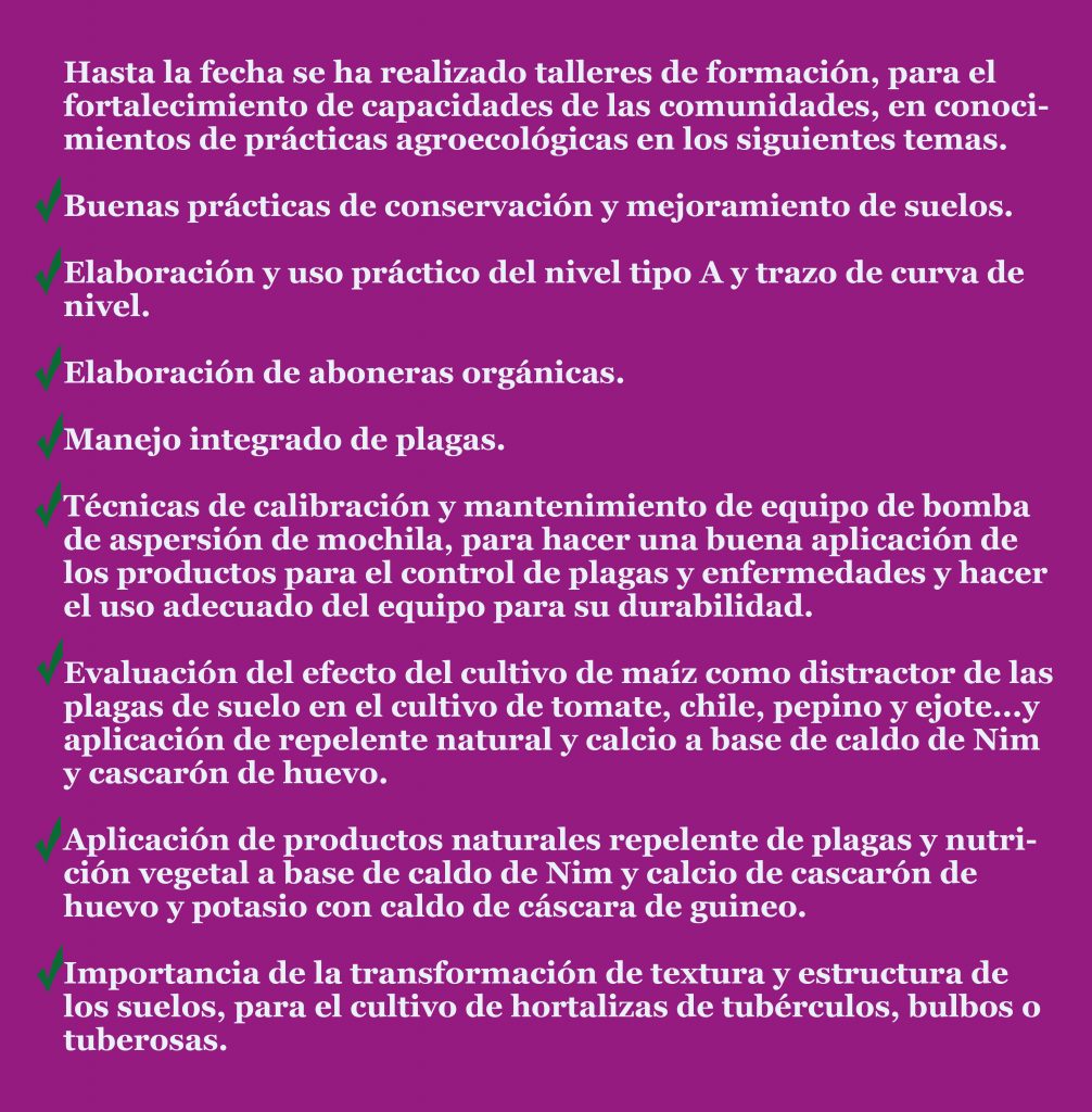 Por otra parte Rosa indica que las capacitaciones recibidas le han ayudado para la siembra de las hortalizas y el cuido de las aves “Nos han dado capacitaciones sobre el cuido del suelo para que no se lave, conocimiento sobre plagas, virus, insectos, hongos que pueden afectar el cultivo, capacitaciones para tratar el suelo antes de sembrar, para elaborar abonos orgánicos, también sobre el cuido de las aves de corral”.
