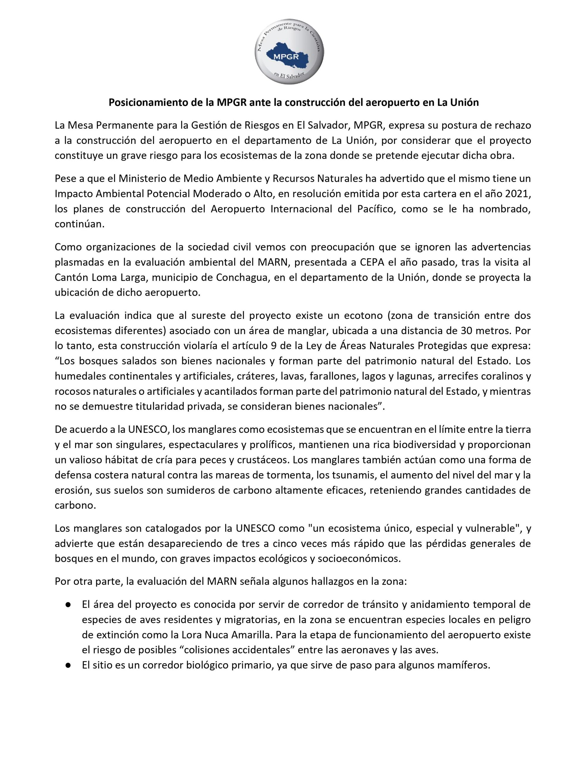 Compartimos el posicionamiento de la MPGR ante la construcción del aeropuerto de La Unión. Nuestra red rechaza este proyecto por considerar que constituye un grave riesgo para los ecosistemas de la zona donde se pretende ejecutar: